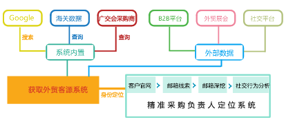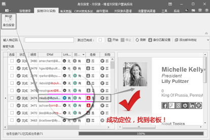 大数据打通全球218个社交平台,可查询到邮箱对应的社交行为和数据,从而精准定位分析公司所有人及其对应的职位信息,找出老板和采购。