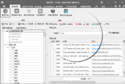 可直接通过外贸狼实现对全球270多个国家和主流搜索引擎Google,Yahoo,Aol等获取精准客户,内置搜索引擎高级指令,一键客户定位排除,批量关键词查询,批量过滤重复网站;