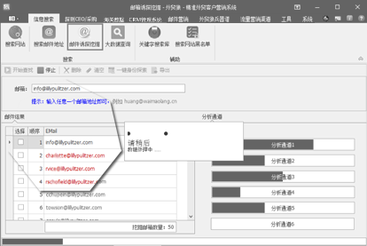 外贸狼打通了6大通道,实现大数据挖掘该公司所有人的邮箱,当然前提是企业邮箱,是用同一个后缀结尾的企业邮箱,我们会把相同后缀的企业邮箱最大程度爬行出来;