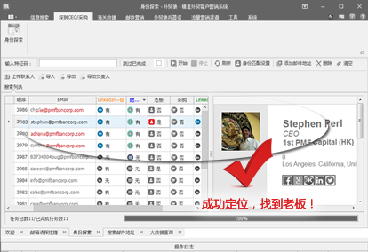 3、探测CEO/采购功能,可一键分析所有邮箱的职位信息;